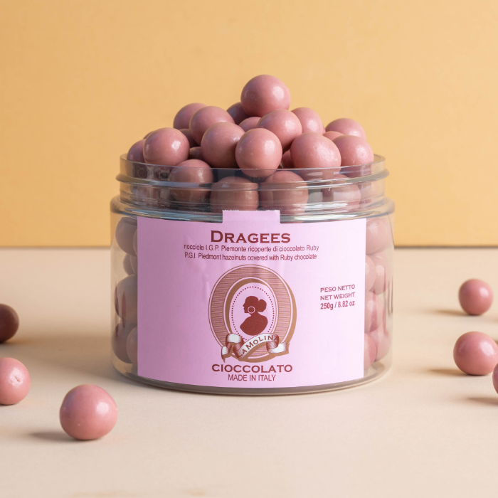 PGI Piedmont hazelnuts covered.. Read MoreRuby Chocolate Dragees