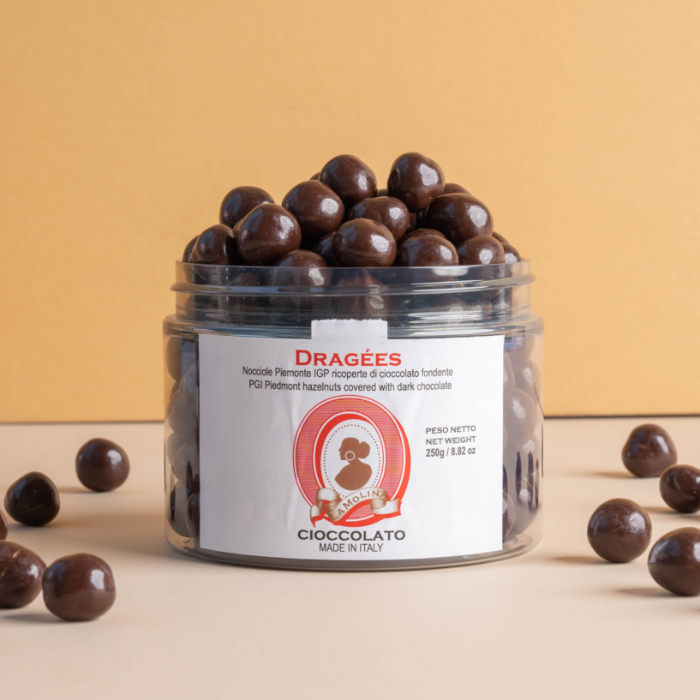 PGI Piedmont hazelnuts covered.. Read MoreDark Chocolate Dragees
