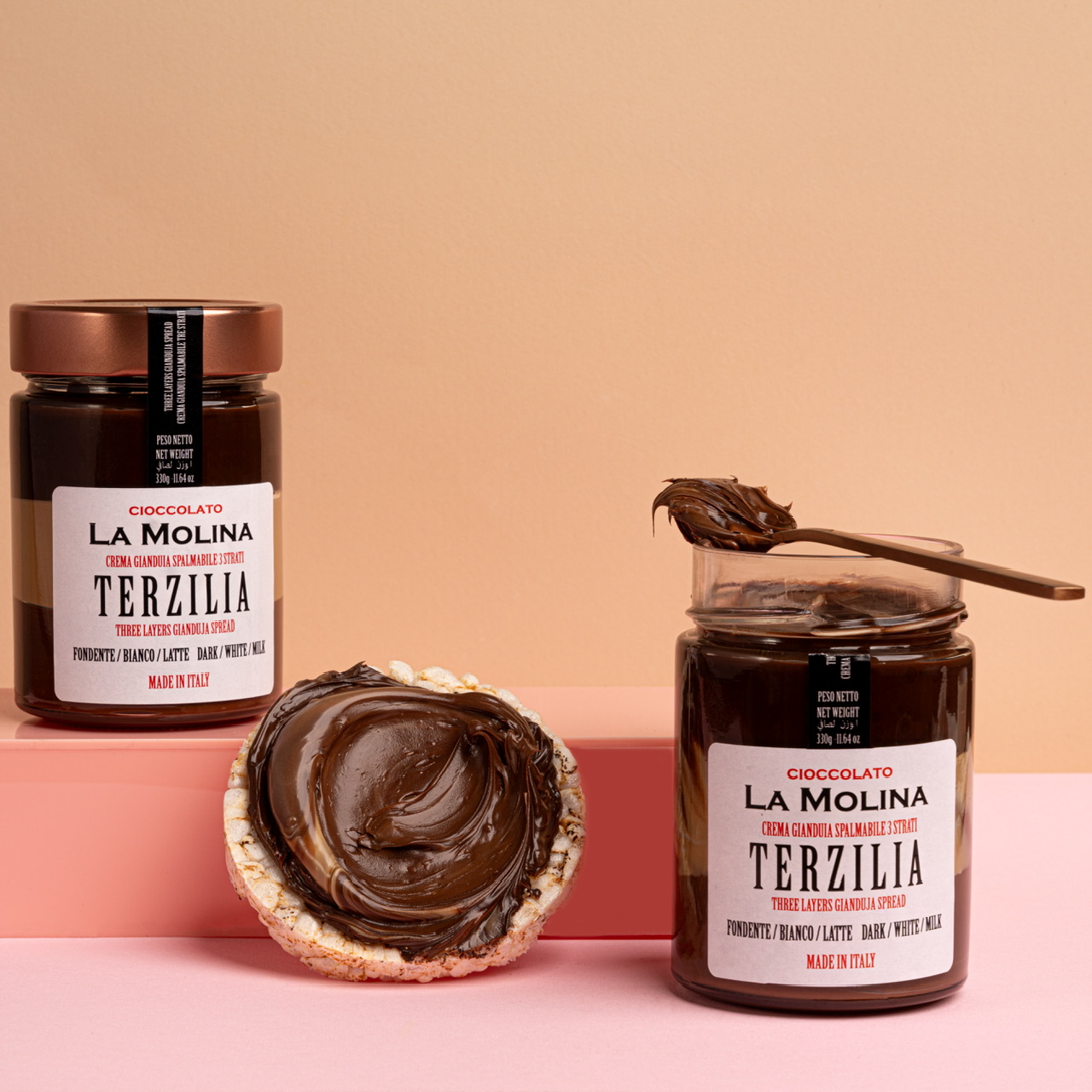 3 layers gianduja spread (dark/white/milk)