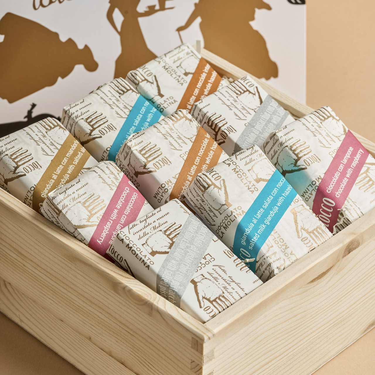 A selection of our best selling La Molina Tocco collection: 9 pieces of mixed flavors, 1 piece wooden box, 1 piece name tag and 1 piece bag